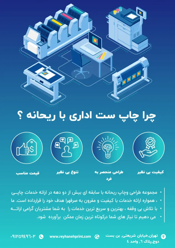 مجموعه چاپ ریحانه با ارائه مشاوره رایگان، طراحی منحصر به فرد، چاپ با کیفیت بالا و ارائه قیمت مناسب به شما کمک میکند تا بهترین ست اداری را برای کسبوکار خود انتخاب کنید.
